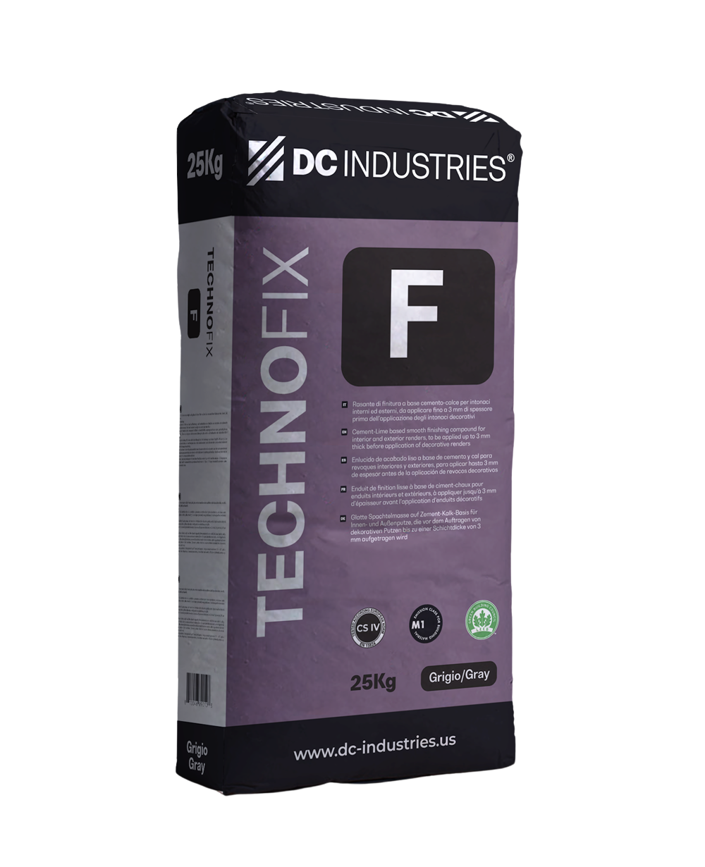 Technoflate F is a one-component, pre-blended, normal-hardening, fine-grained, water-repellent skimming mortar available in grey or white, based on cementitious binders, selected graded aggregates, admixtures and synthetic powder polymers. Due to its special composition, the mortar obtained by mixing with water is easy to apply with a flat metal trowel and finished with a sponge float. Once cured it has a high bonding strength and can be applied at a maximum of 6 mm.